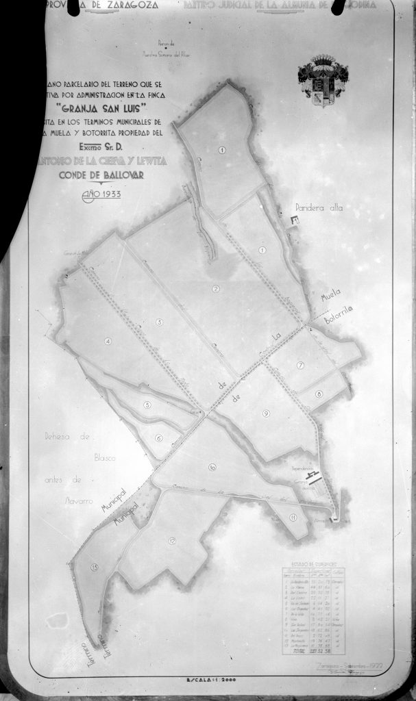 Plano de la finca «Granja San Luis» (La dehesa), propiedad de los condes de Ballobar, año 1933.